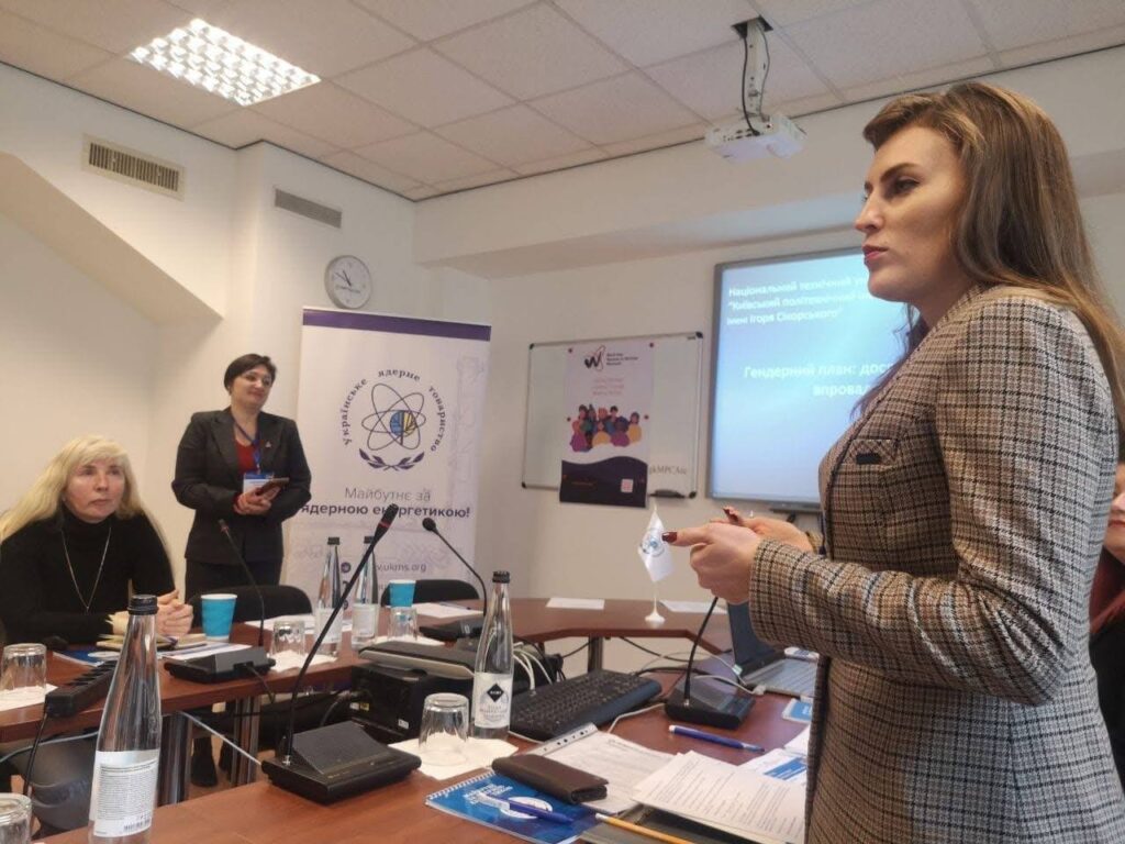 Юлія Стребкова тривалий час викладає філософські дисципліни для майбутніх атомників та атомниць. У своєму виступі доцентка поділилась досвідом розробки Плану гендерної рівності КПІ ім. Ігоря Сікорського та аналізом сучасного стану академічної освіти у галузі атомної енергетики. Адже, наш університет є провідним закладом вищої освіти, що готує інженерних фахівчинь для ядерної енергетики, а випускниці та викладачки різних факультетів є учасницями авторитетних фахових об’єднань та асоціацій.